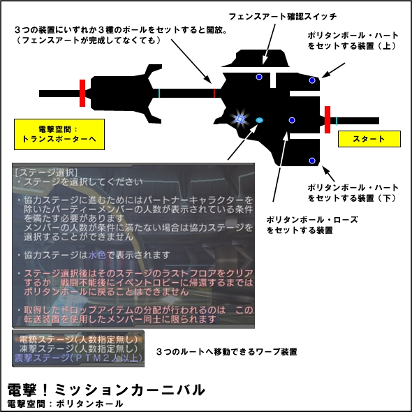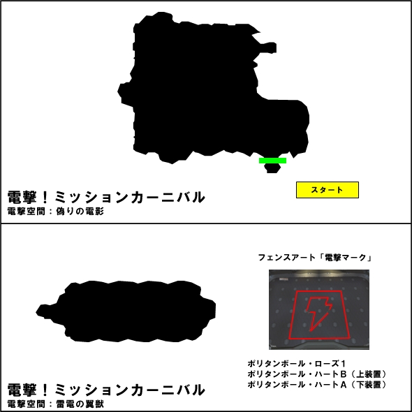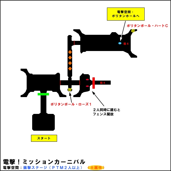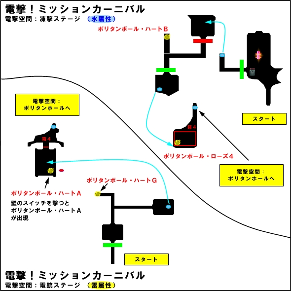 ボールの位置は、 [電杖ステージ] ・道中、進行方向右側の砲台を壊すとポリタンボール・ローズ1が出現 ・最後の区画で敵を全滅させるとフェンスと中央の砲台が消え、ポリタンボール・ハートFが出現 ・最後の区画のついたてをすり抜けることができ、その先にポリタンボール・ハートD