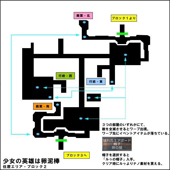 MAPはワープが多く、ショートカット・コースを巧く利用できるかどうかが重要です。 敵は基本無視ですが、倒さないと進めない場所はあります。 また、ルウの帽子を取る場合には倒さないといけない敵がいます。 #どの敵を全滅させると帽子へのワープが出現するかは、B2スタート直後左へ行き階段を下りたところに #出現した敵と同じ敵が正解となっている説と、先にどの行政/商業エリアに入ったかによって #決まる説とがある。