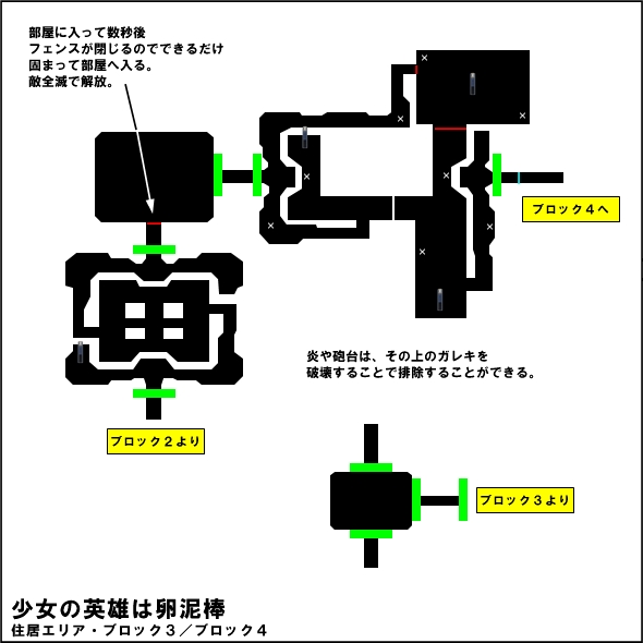 キー・エネミーは、バジラ(西ブロック)、ディストバ(東ブロック)、炎ヴァーラ(南ブロック)の どれかです。 卵を2個回収、かつ、消えてしまう敵と同種類のエネミーを全て倒すと、帽子の拾えるブロックへの ワープが開きます。 |