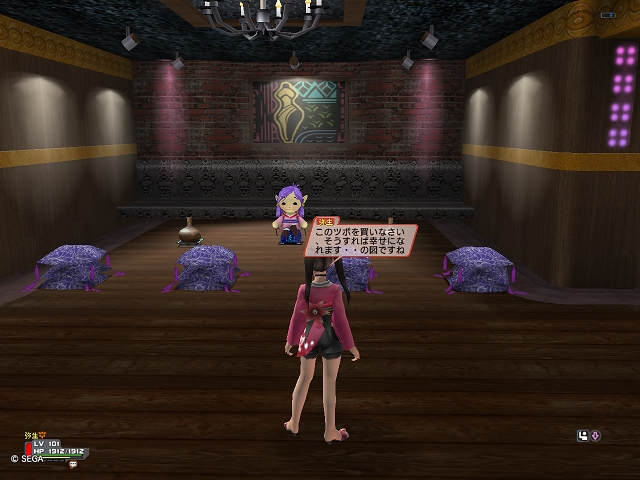 古伊万里の壺: 古代ジパング国の有田という場所で製作された磁器の一種。赤絵に金が施さ れた古伊万里の典型的様式が美しい。グラールに於いては種族や惑星を越え て高い人気があり、作品によっては数十億メセタの値がつくこともある。種 族戦争の時代、戦災を逃れてニューデイズに保管されたものが多く、ニュー デイズで壺や皿、茶碗などが多く見かけられるのはその為である。今回の壺 はかなり質量感のある大きな作品であり、映像処理でどれも同じ壺に見えて しまうのが残念である。